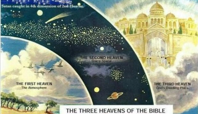 The three heavens and the earth, where; the first heaven is the Universe, the second heaven is the spiritual atmosphere in earth's atmospheric layer influence by mankind, and the third heaven is God's abode or the spritual heaven.